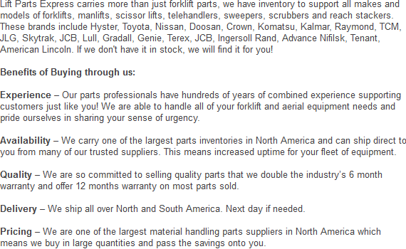 We provide you the best prices on all parts for your fleet of forklifts. If you are interested in receiving a quote for our parts or attachments, give us a phone call today at: